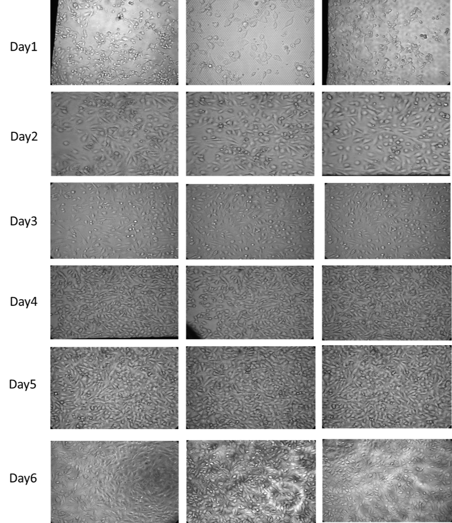 These are the pictures of cells on cytovu. Cells in 3 wells were alive. At first, the cells seemed to be very unhappy with the membrane. But things were better after day2 (I changed media every day).