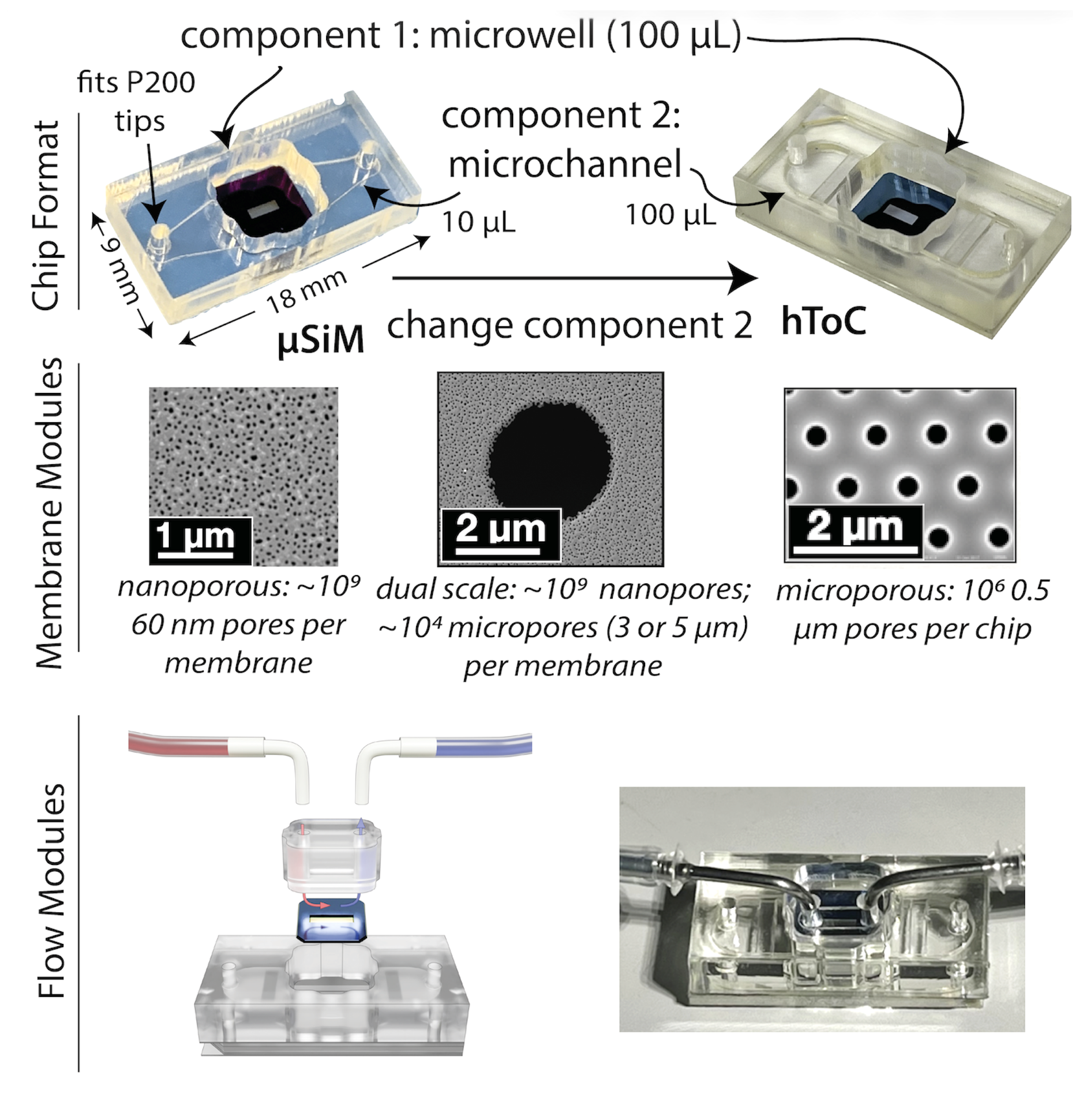 The membranes, for example, can be treated as fully independent modules—nanoporous membranes for unrestricted diffusive signaling, dual-scale membranes for transmigration and contact assays, or microporous membranes when mechanical coupling or structural interaction is required. Likewise, the top and bottom components can be exchanged to introduce microchannels, deep chambers, hydrogel anchors, or specialized access ports, all without significantly altering methods for device handling, cell seeding, imaging, or compatibility with accessories and expansion options. Expansion to flow can be achieved for any µSiM-based chip via the PSA-based addition of a flow-insert module. In this way, a growing library of interchangeable elements creates a development toolbox built on a common and well-understood underlying architecture, yet offering boundless options for redesign and reconfiguration tailored to the needs of novel tissue-on-a-chip applications.