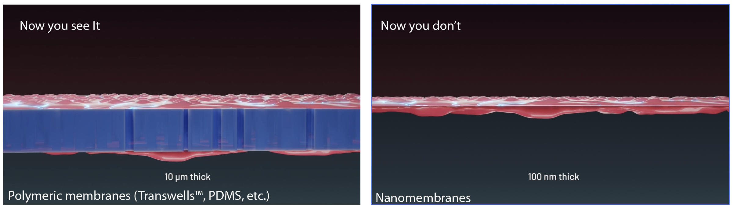 Arguably the most impactful application of nanomembrane technology to date is their use in barrier cell culture and in multicellular models of human “tissue-on-a-chip.” Compatibility with cell culture was established early10 to address an unmet need for porous substrates that overcome the poor imaging characteristics of commercial Transwells™ used to study barrier-forming endothelial and epithelial cells9. Used as a tool for compartmentalizing multicellular tissue models, nanomembranes offer numerous advantages over conventional strategies employing much thicker polymeric membranes or semi-porous walls. Unlike these approaches, nanomembranes provide an ultrathin, exceedingly permeable, and optically clear interface that defines the barrier between tissue compartments. In this way, the exchange of paracrine factors, cytokines, metabolites, and nutrients occurs at rates set by the cells and their self-assembled matrices rather than by the membrane itself. Because the membranes are thinner than the wavelength of light and thinner than a confocal optical slice, they are undetectable in fluorescence microscopy and vanish in 3D reconstructions of the basement membranes formed at compartment interfaces24,25. Innovative, dual-scale nanomembranes support controlled transcellular transmigration and multicellular interactions through patterned micropores while preserving the diffusive continuity of the nanoporous background26. Democratizing access to the unique qualities of nanomembranes for barrier and tissue-chip development is the primary motivation of µSiM27: a modular microfluidic device that enables non-engineering laboratories to design, build and manufacture custom chips for diverse tissue models17,24,28-30.